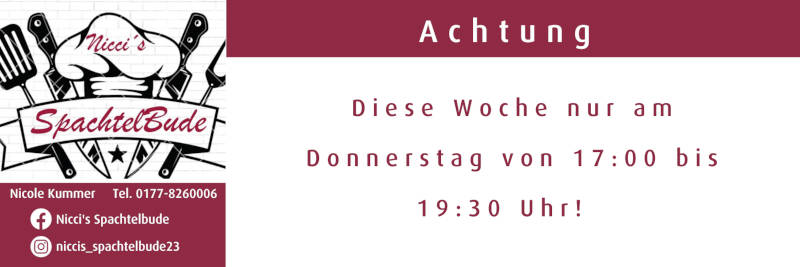 Achtung: Diese Woche ist Nicci’s Spachtelbude nur heute von 17:00 bis 19:30 Uhr da. Aber wie immer gibt es leckere warme Speisen wie Bratwurst, Currywurst, Pommes, Flammkuchen und co.