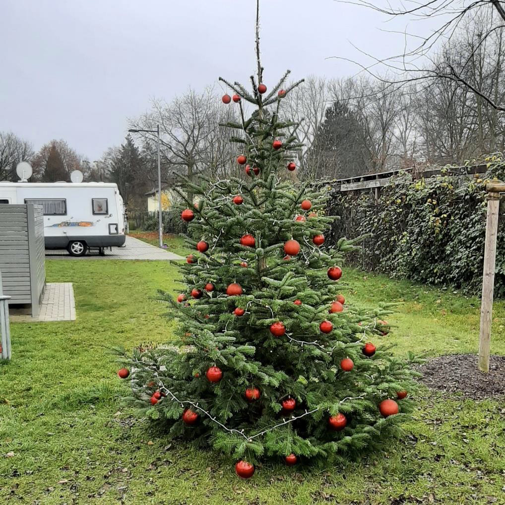 „Unser Weihnachtsbaum“ begrüßt unsere Gäste am Eingang zum Stellplatz.