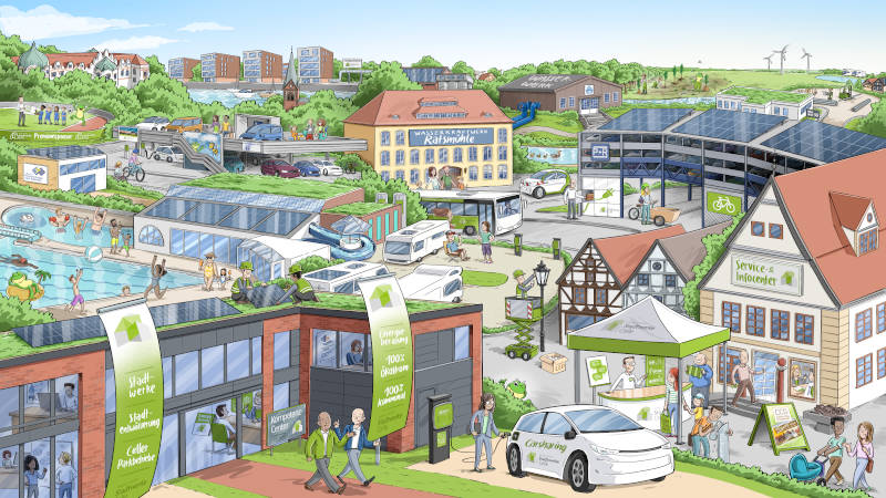 Zum 10-jährigen Jubiläum ihres Energievertriebs haben die Stadtwerke Celle ein detailreiches Wimmelbild erstellen lassen, das die Vielfalt ihrer Leistungen zeigt.