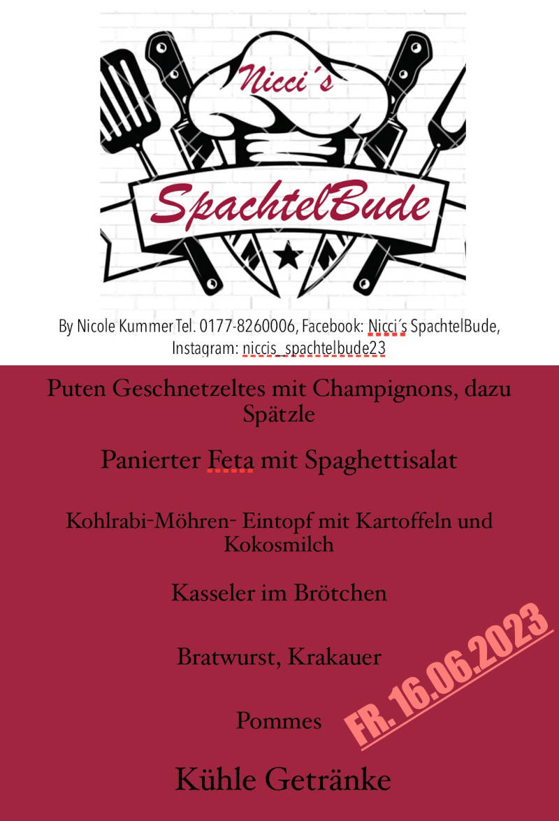 Am Freitag, den 16.06.2023 kommt ab 13 Uhr das erste Mal der Foodtruck „Nicci’s Spachtelbude“ und wird leckere Speisen und kalte Getränke anbieten.