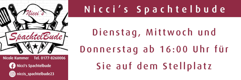 Seit dieser Woche ist der beliebte Foodtruck Nicci’s Spachtelbude da! Endlich gibt es wieder frische, leckere Gerichten und kühle Getränke für Sie auf unserem Stellplatz.