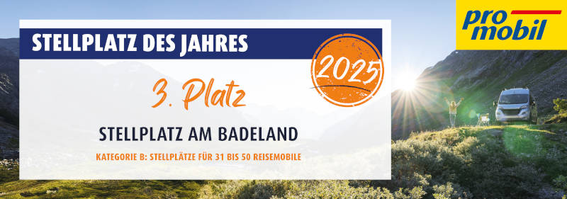 Bei der Leserwahl „Die Stellplätze des Jahres 2025“ von Promobil hat es unser Wohnmobilstellplatz in der Kategorie B: Stellplätze für 31 bis 50 Reisemobile auf den 3. Platz geschafft.