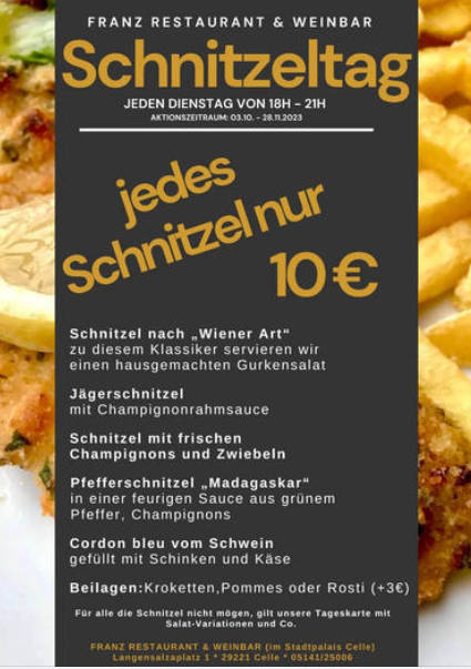 eden Dienstag ist Schnitzeltag direkt gegenüber im Restaurant Franz beim Stadtpalais!