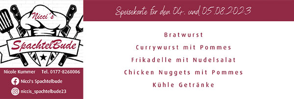 Diese Woche kommt der Foodtruck „Nicci’s Spachtelbude“ wieder Freitag und Samstag! Am Freitag von 11:00 Uhr bis 14:00 Uhr und von 17:00 bis 19:00 Uhr und am Samstag von 11:00 bis 14:00 Uhr. Es werden wieder ausgewählte Speisen und Getränke angeboten. Statten Sie ihr doch gerne einen Besuch ab und überzeugen sich selbst von der tollen Qualität der leckeren Speisen!
